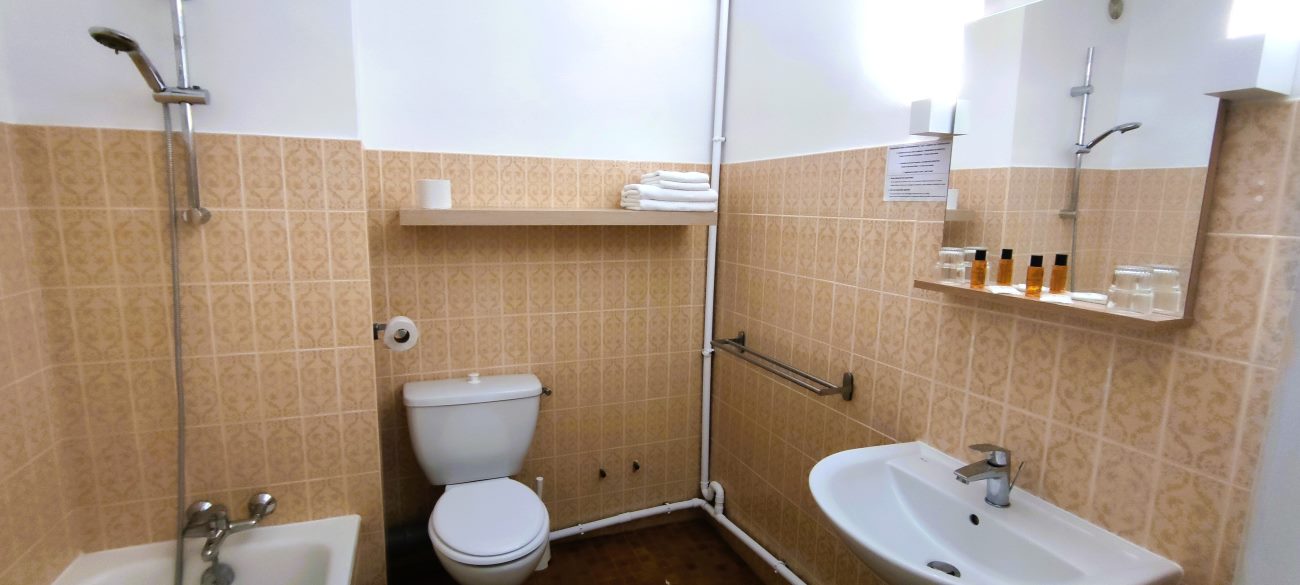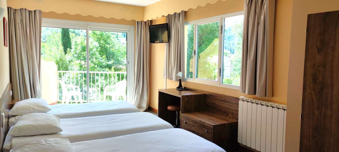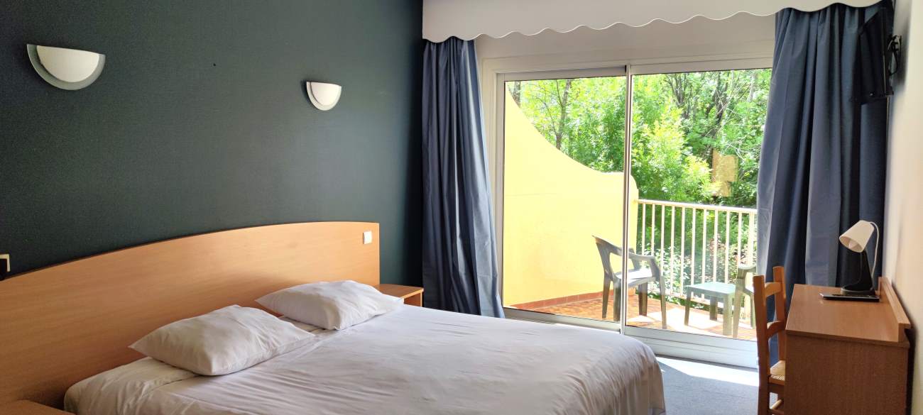 Nous vous proposons 36 chambres seventies, spacieuses, au calme et climatisées avec ou sans terrasse exposées Sud avec une vue sur le rocher Saint-Julien: